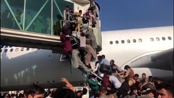 In another video, hundreds of people could be seen hundreds of people running across the tarmac as U.S. soldiers fired warning shots in the air. One showed a crowd pushing and shoving its way up a staircase, trying to board a plane, with some people hanging off the railings.