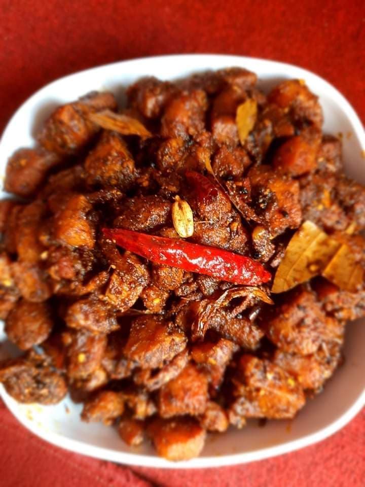 2). Fry some fenugreek, Cloves, cardamom, cinnamon, basil leaves, asafoetida and dry red chili in the same oil that was used for frying the chicken. Add some finely chopped ginger and garlic with bits of red chili powder and turmeric powder, in the process.
