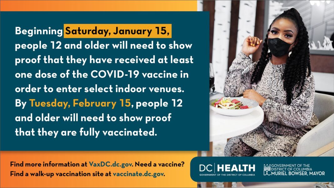 The District’s vaccine entry requirement is now into effect on Saturday, January 15 at 6:00 a.m.