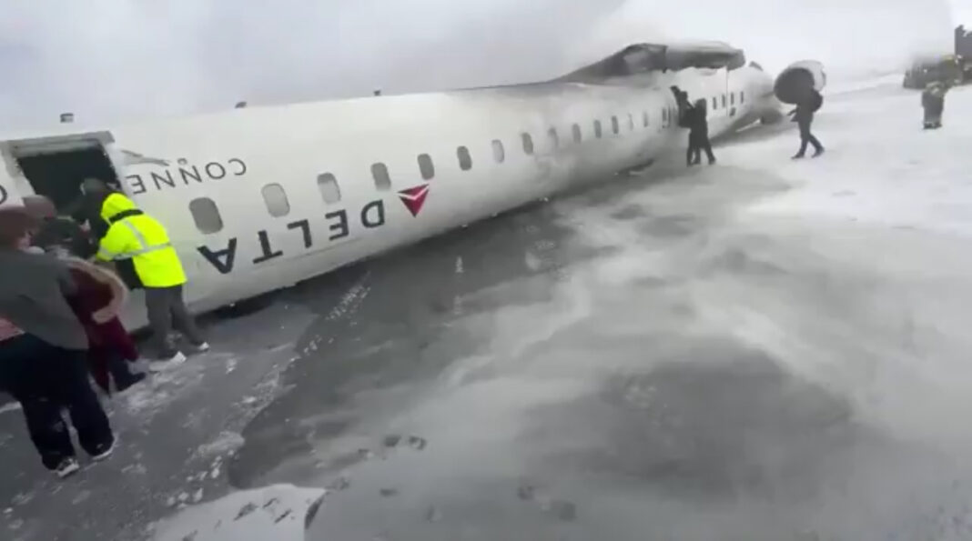 A Delta Air Lines flight from Minneapolis landed at Toronto Pearson International Airport on Monday but skidded off the runway, flipping onto its back in snowy conditions, according to photos and reports circulating on social media.