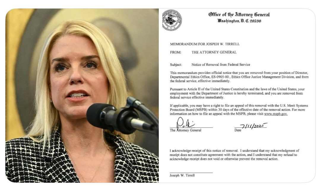 The letter, addressed directly to Tirrell, declares his removal from the federal service under the authority of Article II of the U.S. Constitution and applicable federal law. Tirrell served as the Director within the Justice Management Division’s Ethics Office, a senior executive position (ES-0905-00) responsible for overseeing compliance with departmental ethics policies.