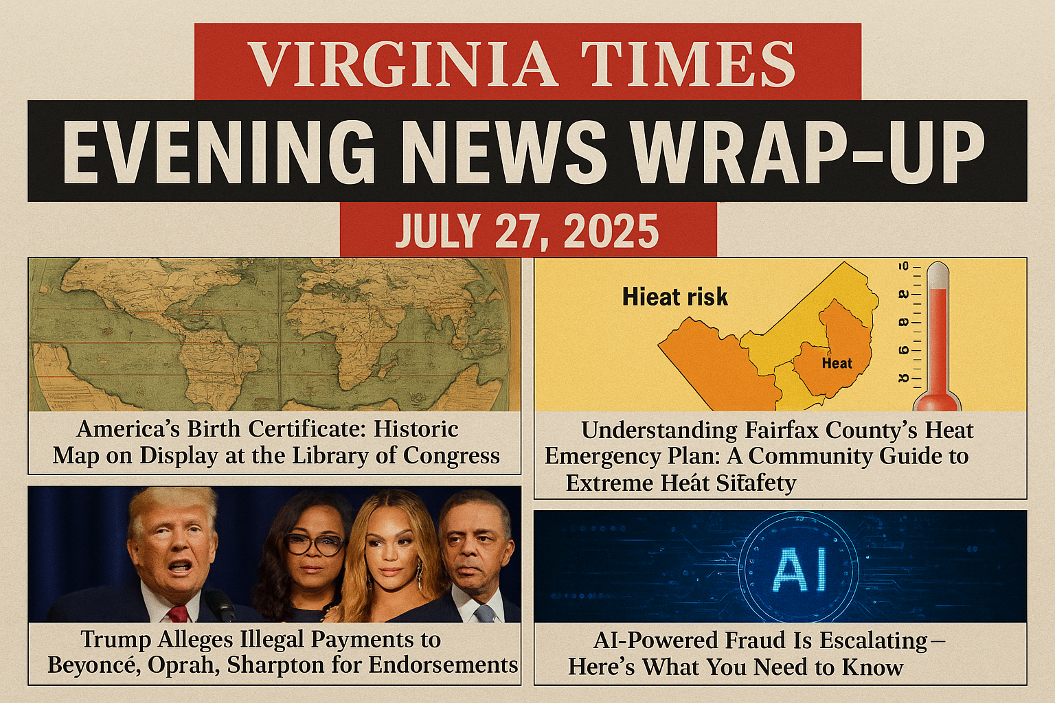 From historic revelations to climate warnings and global diplomacy, here’s your evening digest from Virginia Times for Sunday, July 27, 2025. We spotlight the day’s top stories—including the unveiling of the 1507 Waldseemüller map, Fairfax’s heat emergency plan, alarming new trends in AI-driven fraud, and humanitarian updates from Gaza. Catch up on the news that shaped your world today.