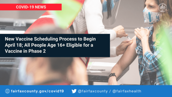 Beginning Sunday, April 18, all individuals in the Fairfax Health District who are 16 or older will be eligible to directly schedule a vaccine appointment through VaccineFinder.org as Fairfax County moves into Phase 2 with the rest of Virginia. With this new system, Fairfax County will no longer accept registrations for the COVID-19 vaccine.
