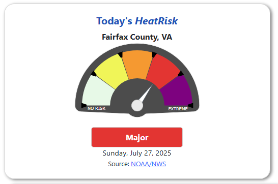 Fairfax County activated its heat emergency response plan on Sunday, July 27, following a Heat Advisory issued by the National Weather Service (NWS) at 5:01 a.m. EDT. The advisory, in effect from 12:00 p.m. to 8:00 p.m., warns of heat index values reaching up to 107°F, prompting urgent public health precautions across the region.