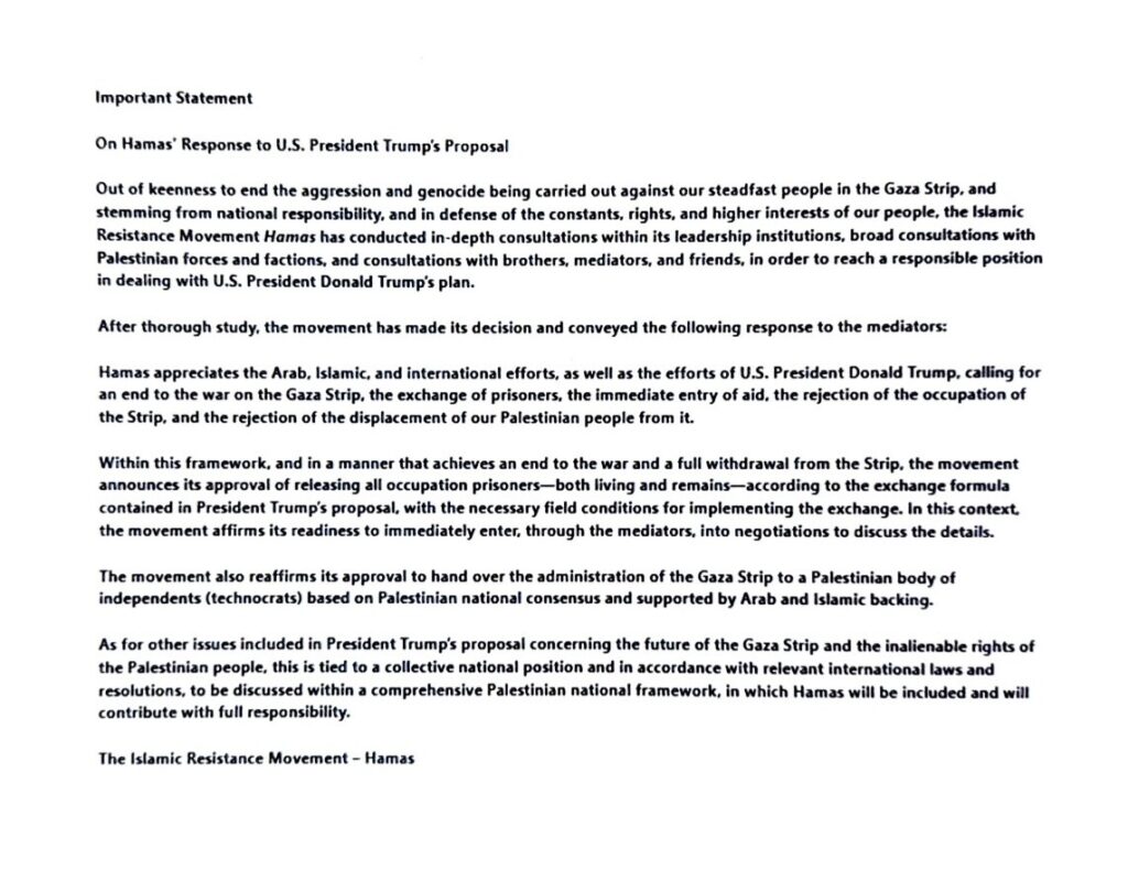 Hamas, which earlier circulated language rejecting a U.S. proposal as biased and urging Palestinians and regional governments to oppose normalization with Israel (Hamas statement as posted by Trump on Truth Social:), has now issued a separate written statement after Trump’s ultimatum signaling readiness to discuss terms through mediators.