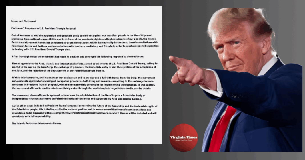 In the new document shared by President Trump on Truth Social , titled “Important Statement on Hamas’ Response to U.S. President Trump’s Proposal” and reviewed by Virginia Times, Hamas says it “appreciates the Arab, Islamic, and international efforts, as well as the efforts of U.S. President Donald Trump,” and outlines conditional steps it is prepared to take. The movement announces its approval to release “all occupation prisoners—both living and remains—according to the exchange formula contained in President Trump’s proposal,” with “necessary field conditions” for implementation. It affirms readiness to “immediately enter, through the mediators, into negotiations to discuss the details.”
