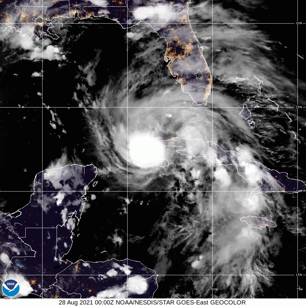 As of 4:00 AM CDT Sat Aug 28 the center of Ida was located near 24.0, -85.2 with movement NW at 16 mph. The minimum central pressure was 987 mb with maximum sustained winds of about 80 mph.