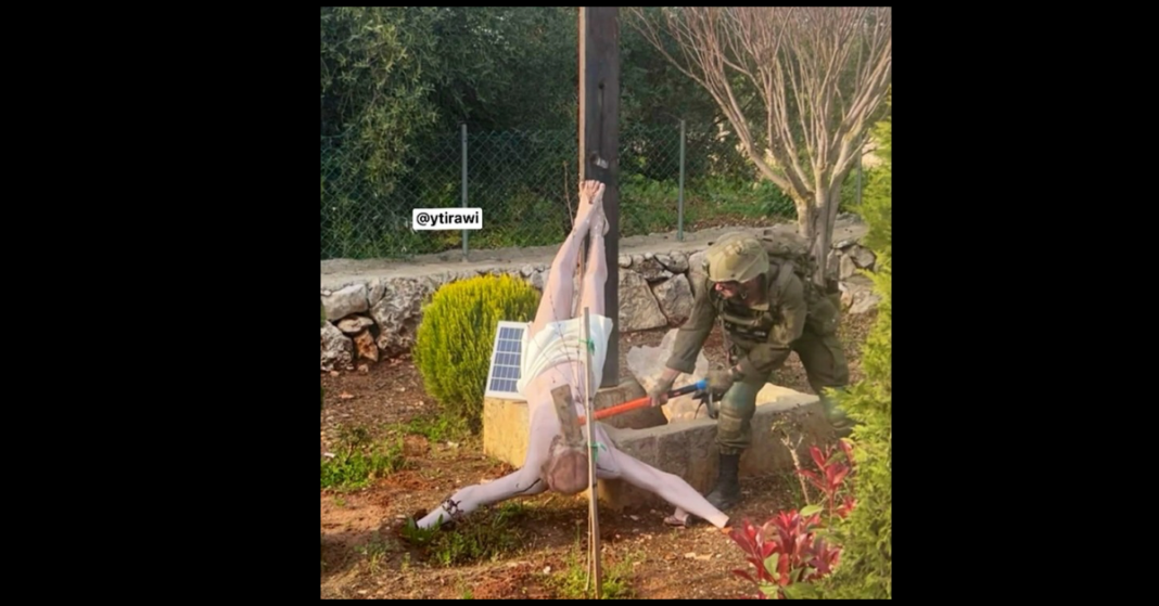 The picture, which quickly went viral on social media on Sunday, shows a soldier in uniform from the Israel Defense Forces hitting the head of a Jesus statue that had been taken off its cross in Debel, a Maronite Christian village about three miles from the Israeli border.