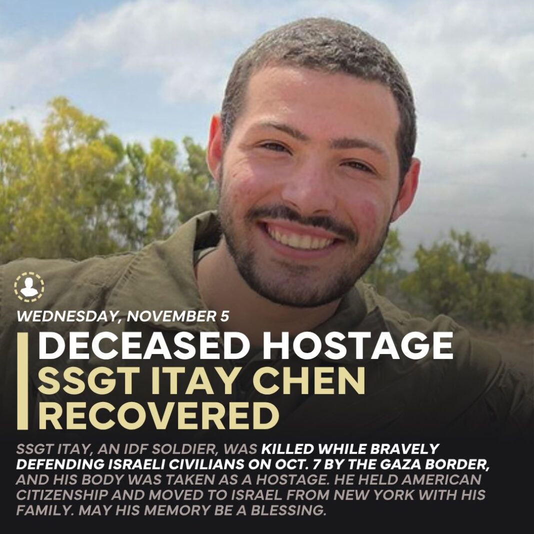The IDF said Chen served as a combat soldier in the 7th Armored Brigade’s 77th Battalion, fell in his tank during fighting at Kibbutz Nir Oz on the morning of Oct. 7, 2023, was abducted by Hamas, and was officially declared dead on March 10, 2024. He is survived by his parents and two brothers.