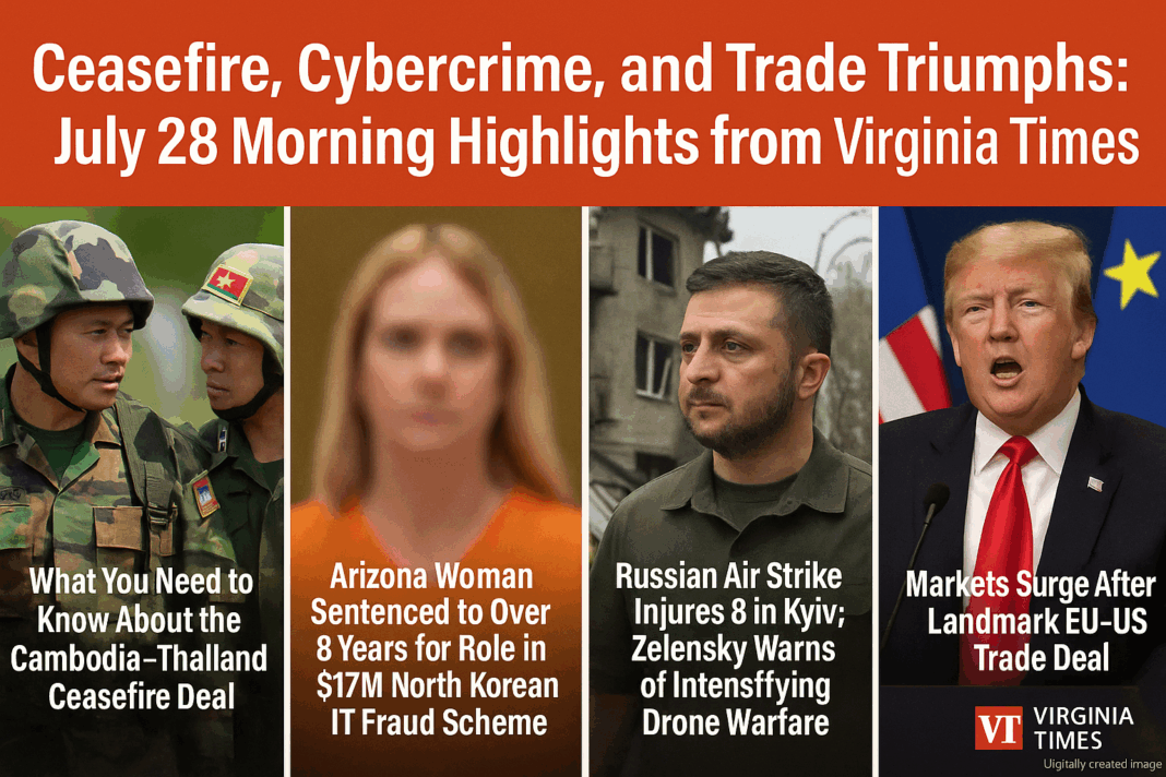 This is your Virginia Times Morning News Highlights for Monday, July 28, 2025, featuring major developments across Asia, Europe, and the United States. From a surprise ceasefire in Southeast Asia to U.S. court rulings and intensifying war in Ukraine, here’s what you need to know to start your day informed.