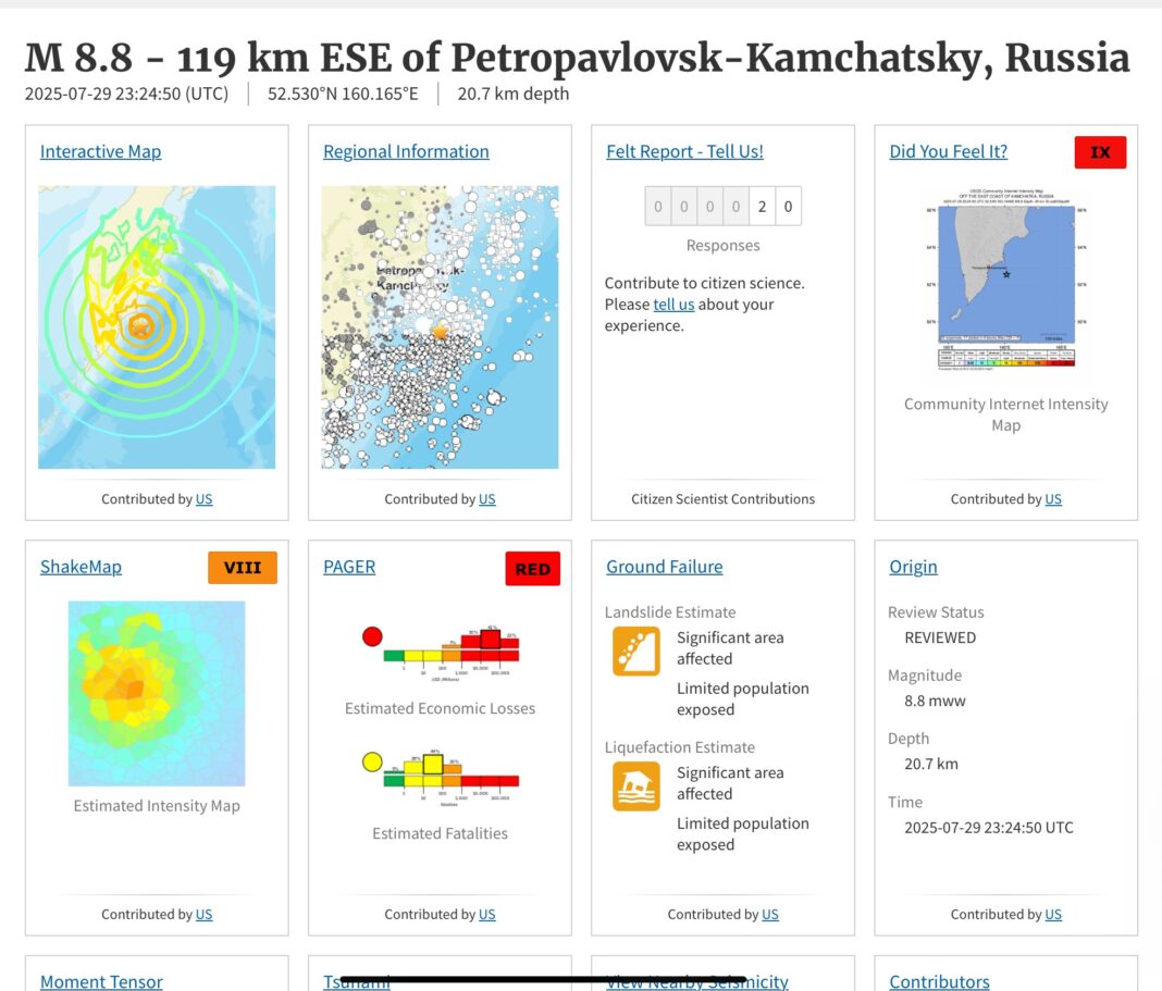 A powerful magnitude 8.8 earthquake struck off the eastern coast of Russia’s Kamchatka Peninsula on Monday evening, according to the U.S. Geological Survey (USGS). The tremor occurred at approximately 7:24 p.m. ET (July 29) and has triggered tsunami warnings along the entire U.S. West Coast and portions of the Alaska Aleutian Islands.