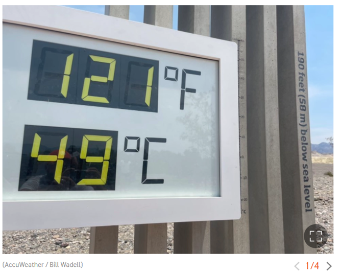 Death Valley is certainly living up to its name as AccuWeather forecasters are cautioning that “most outdoor activity is potentially life-threatening” in such extreme heat, which will continue through the week. AccuWeather National Reporter Bill Wadell is in Death Valley and reporting from there on the network. By 9 a.m. on Wednesday the temperature had hit 106 there and kept going. After 1 p.m., the mercury had risen to 121.