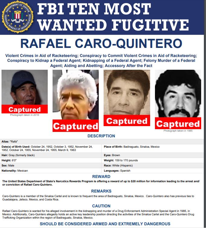 Rafael Caro-Quintero, was on the FBI’s ten most wanted fugitive list, for his alleged involvement in the kidnapping and murder of Drug Enforcement Administration Special Agent Enrique “Kiki” Camarena in 1985, in Mexico. Additionally, Caro-Quintero allegedly holds an active key leadership position directing the activities of the Sinaloa Cartel and the Caro-Quintero Drug Trafficking Organization within the region of Badiraguato, Sinaloa, Mexico.
