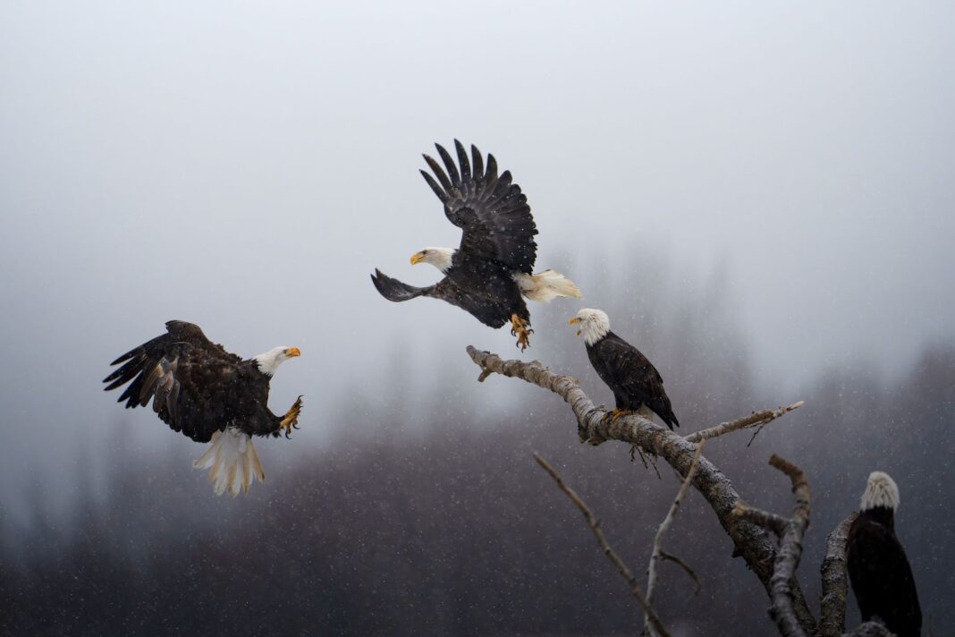 Karthik Subramaniam’s photo “Dance of the Eagles” was declared the first prize winner. The winning photo depicts a bald eagle battling its fellows for a prime spot on a tree in the Chilkat Bald Eagle Preserve in Alaska.