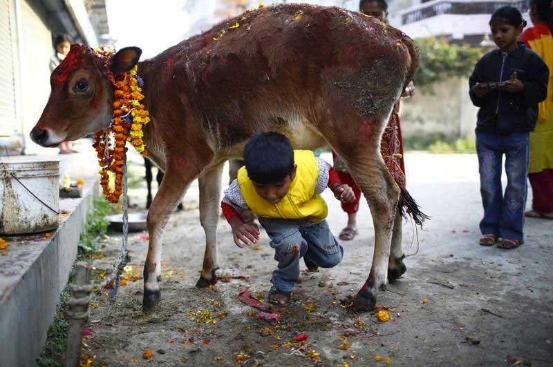 The morning of the third day is called Gai (cow) Tihar. The cow is an especially important animal in Hinduism and is considered sacred. The cow is the ‘Vahan’ of the goddess of wealth Lakshmi and therefore is also related to prosperity.
