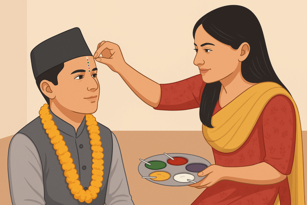 In Tihar’s Bhaitika, the custom of wearing a Dhaka topi (hat) on the head of a brother has a special meaning. Like a hat, a Dhaka hat is given as a gift with a symbolic message that the head of the brother should be high. On the other hand, there is an opinion that the head of a relative should not be left empty in Bhaitika. This is the reason why hats are worn.