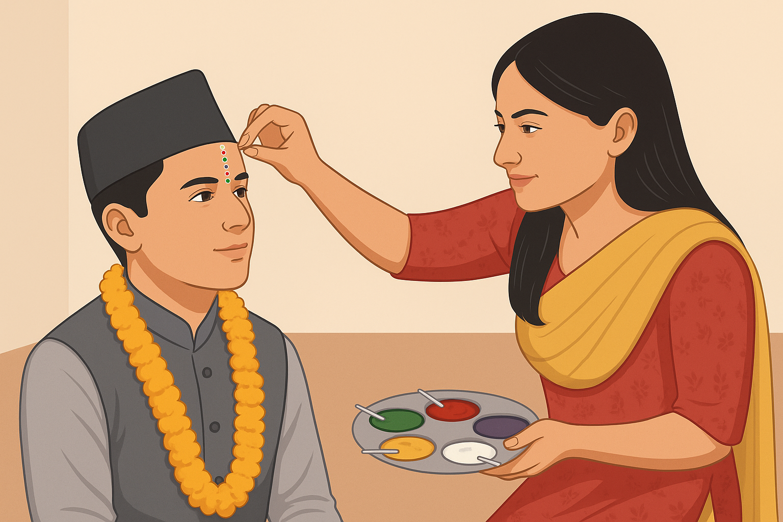 On the fifth day of Tihar, the sisters create a protective barrier of water and blessed oil around their brothers, surrounding them several times. A special garland made from the Makhamali flower (Gomphrena globosa) is placed around the brother’s neck, as this flower is known for its long life. The tika placed on the brother’s forehead is also unique, as it consists of seven different colors. Also, the brother places the tika on the sister’s forehead.