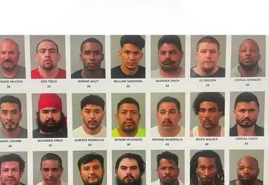 Among those apprehended were Salvador Salcedo (56), Daniel Hernandez (36), Diego Gonzalez (36), Jose Trejo (33), Jasvinder Singh (35), Joginder Singh (54), Ronnie Germaine Wiley (30), Alberto Rodriguez (23), Antonio Romero Jr. (30), William Alfredo Perez Sandoval (26), Mynor Velasquez (38), Rolando Lopez (23), Rajinder Pal Singh (54), Michael Peter Muratalla (43), Nishan Singh (33), Eli Robert Wilson (29), Rickie Travon Walker (40), Devon Paul Taylor (31), Joshua Jermira Johnson (38), Karnail Singh (44), and Christopher Lee Grinner (36).