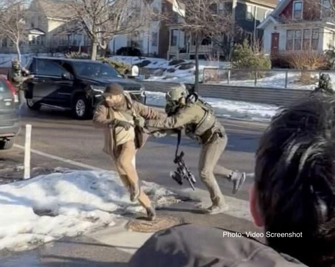 The footage, published online and spreading widely, was recorded by The News Movement and shows a man in winter clothing spitting at a vehicle with emergency lights before delivering kicks that leave the right taillight broken and dangling, the YouTube video shows. Agents then exit, grab the man, and tackle him.
