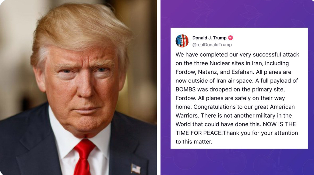 “We have completed our very successful attack on the three Nuclear sites in Iran… A full payload of BOMBS was dropped on the primary site, Fordow. All planes are safely on their way home. Congratulations to our great American Warriors… NOW IS THE TIME FOR PEACE!”