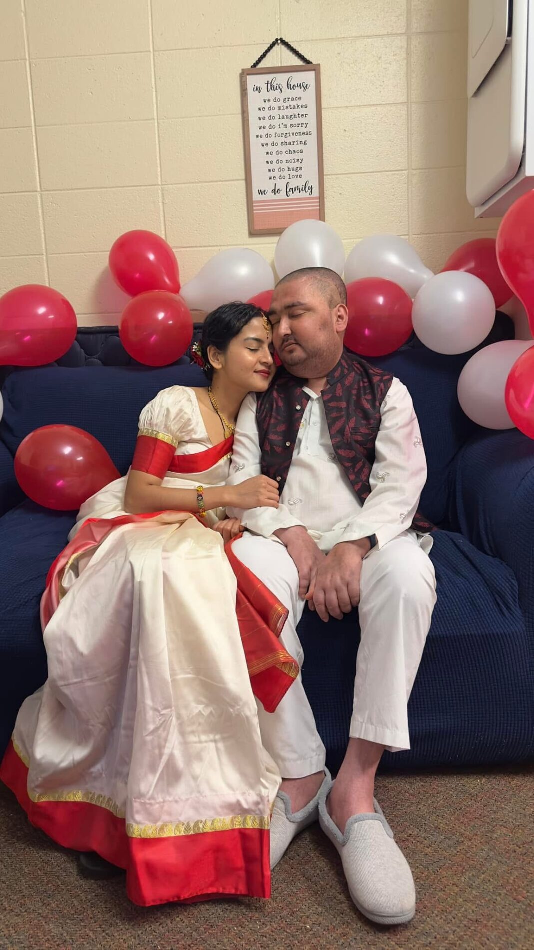 The last image is a celebration of life and love. Dressed in traditional attire, the couple holds a cake together, marking a special moment. Srijana knows that Bibek’s illness is terminal, and yet she chooses to celebrate his birthday with joy and grandeur. Their smiles shine through the photograph, surrounded by red and white balloons, symbols of passion and purity. It is a victory of love—a triumph of choosing each other despite life’s greatest challenges.