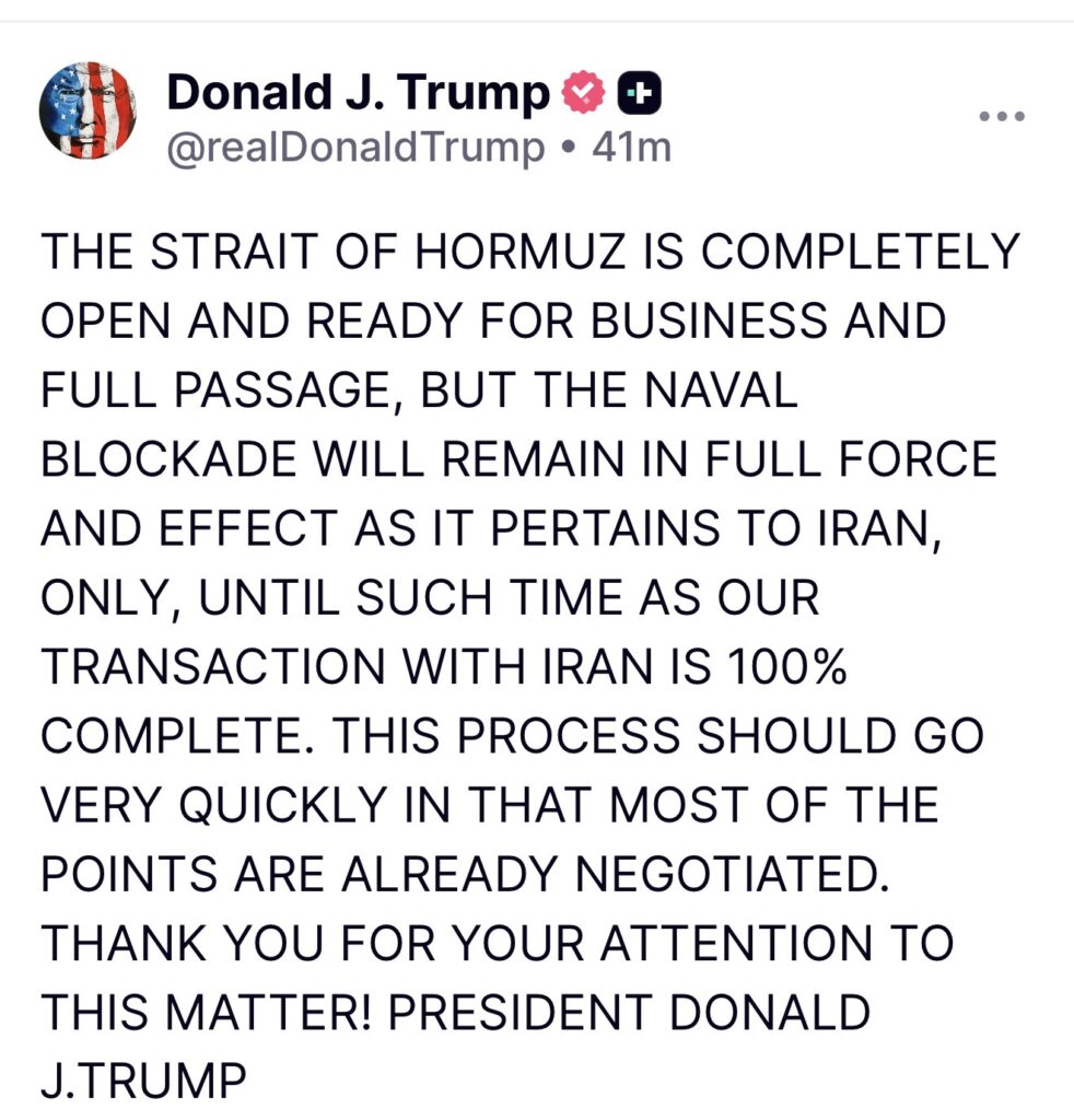 In a post on Truth Social, Trump wrote that the strait is “completely open and ready for business and full passage,” while the blockade will remain “in full force and effect” as it pertains to Iran only. He added that the process should move quickly because “most of the points are already negotiated.”