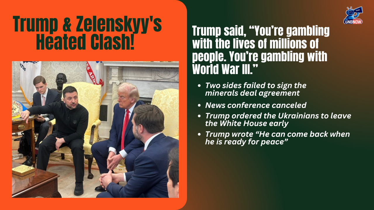 Washington, D.C.—The highly anticipated meeting between U.S. President Donald Trump and Ukrainian President Volodymyr Zelenskyy on February 28, 2025, took an unexpected turn, ending in a heated exchange in the Oval Office. Originally intended to discuss a potential U.S.-Ukraine partnership on rare-earth minerals and security assurances, the meeting quickly escalated into a public confrontation.