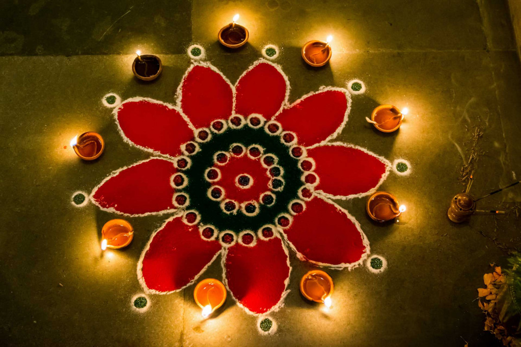 Nepalis also make patterns on the floors of living rooms or courtyards using materials such as colored rice, dry flour, colored sand, or flower petals, called Rangoli, as a sacred welcoming for the gods and goddesses, particularly Lakshmi.