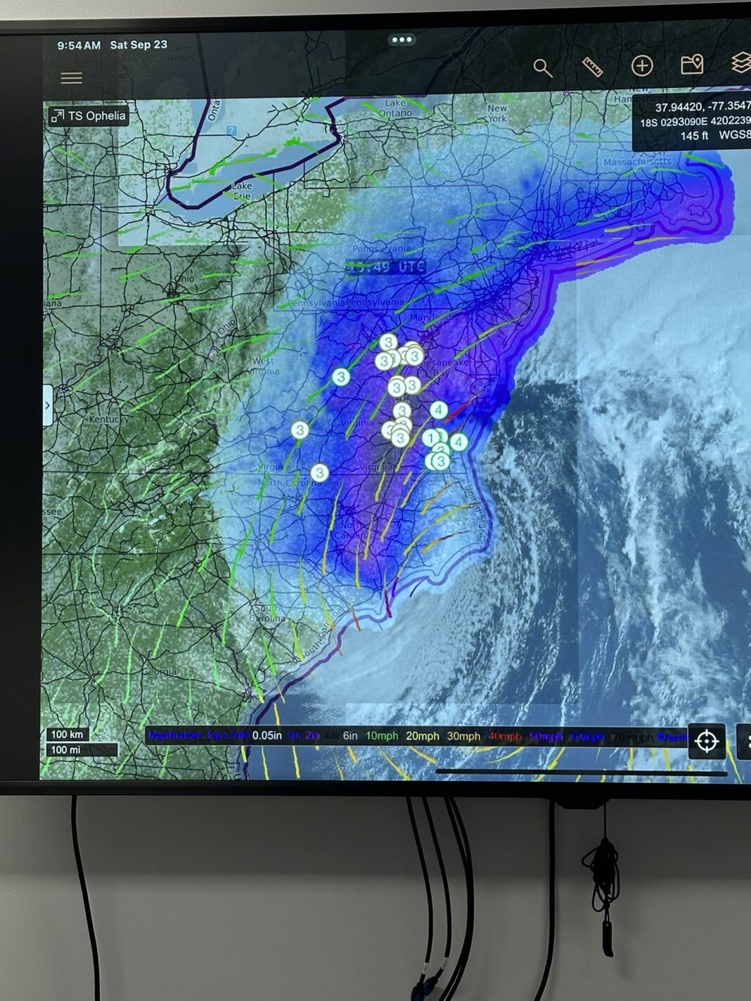 The NHC warned that Ophelia could produce life-threatening storm surge inundation over portions of eastern North Carolina and southeastern Virginia, including Pamlico and Albemarle Sounds, the Neuse and Pamlico Rivers, the lower James River, and the lower Chesapeake Bay. Storm Surge Warnings are in place for these areas, where water levels could reach 2 to 4 feet above ground level within the next few hours. Residents in these areas should follow advice given by local officials and evacuate if ordered.