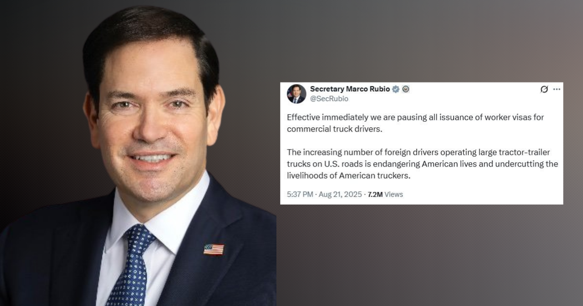 “Effective immediately we are pausing all issuance of worker visas for commercial truck drivers. The increasing number of foreign drivers operating large tractor-trailer trucks on U.S. roads is endangering American lives and undercutting the livelihoods of American truckers.” — Marco Rubio, as posted on X