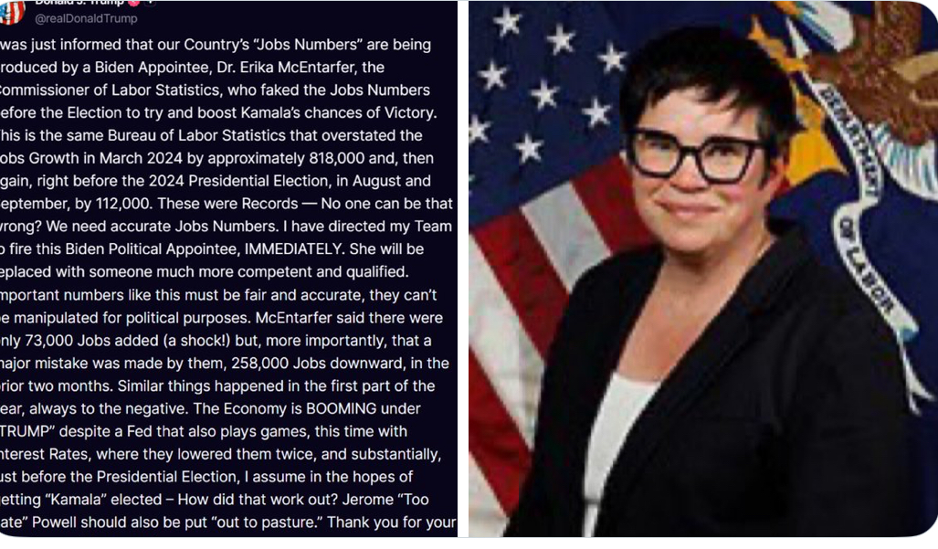 - Trump accused BLS Commissioner Dr. Erika McEntarfer of manipulating jobs data to help Kamala Harris in 2024.