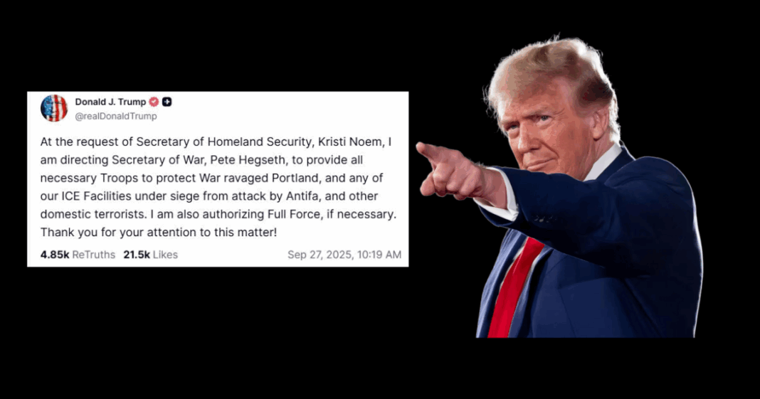 President Donald Trump said he has directed Defense Secretary Pete Hegseth to provide “all necessary troops” to protect Portland and federal immigration facilities, citing threats from “Antifa and other domestic terrorists.” The statement was posted on the president’s Truth Social, where he also said he is authorizing “full force, if necessary.”