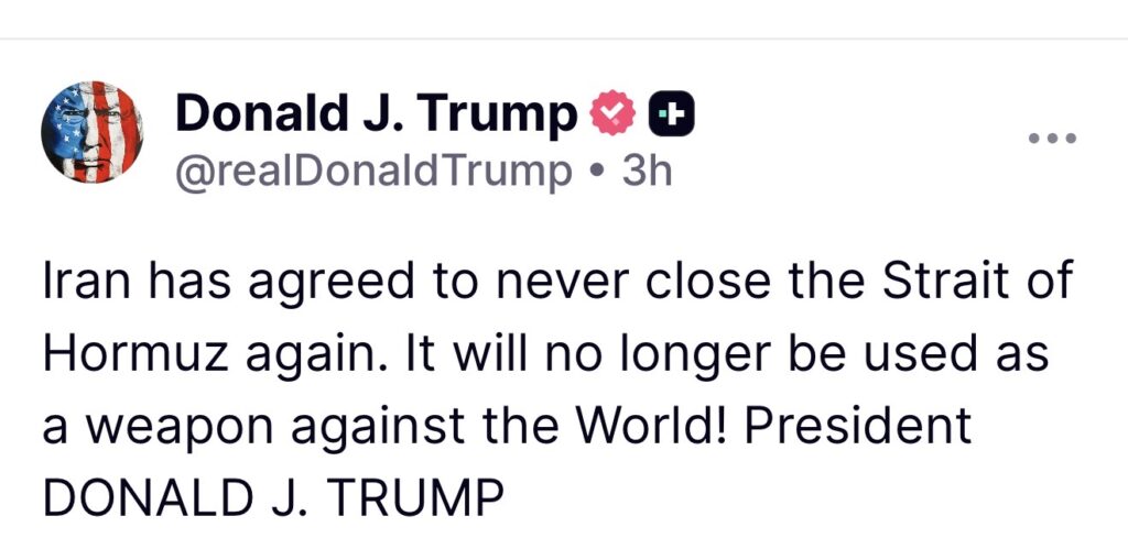 On Friday, President Donald Trump wrote several posts on Truth Social, saying Iran had agreed never to close the Strait of Hormuz again and that the waterway would no longer be used “as a weapon against the World.”
