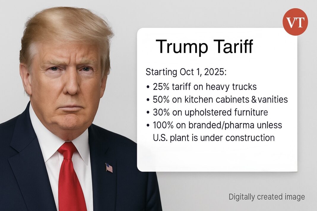 President Donald Trump announced a new set of import tariffs late Thursday that will take effect Oct. 1, including a 25% duty on heavy trucks, 50% on kitchen cabinets and bathroom vanities, and 30% on upholstered furniture. He also said branded or patented pharmaceutical products would face a tariff of up to 100%. The announcement was made in posts on Truth Social.