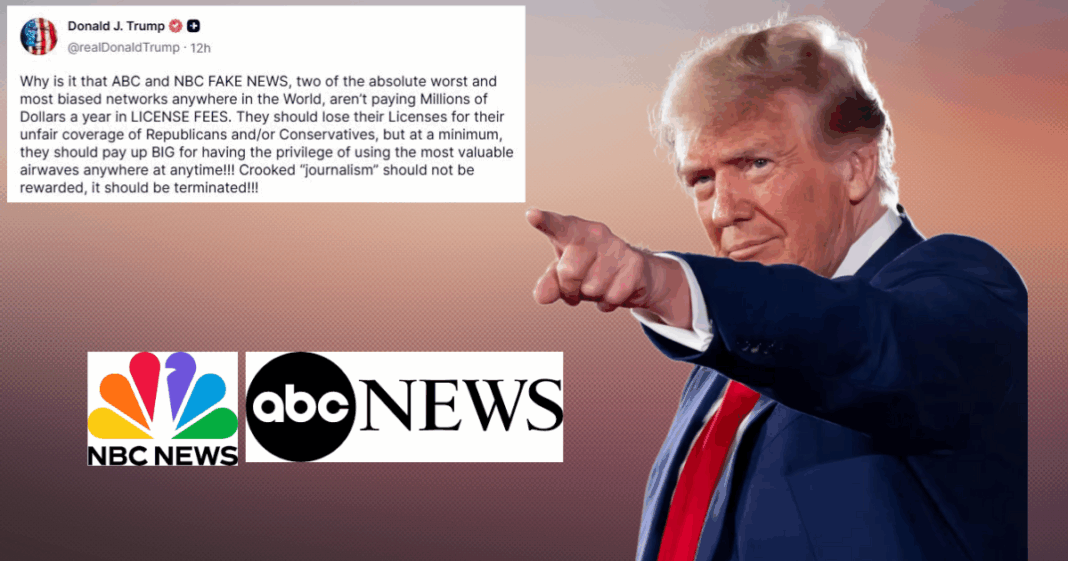 He asked why ABC and NBC “aren’t paying Millions of Dollars a year in LICENSE FEES” in a different post, claimed that they ought to “lose their licenses for their unfair coverage of Republicans and/or Conservatives,” and added that “crooked ‘journalism’ should not be rewarded.”