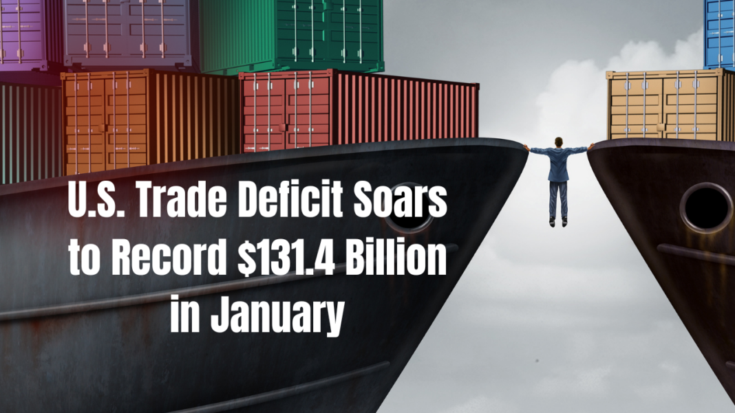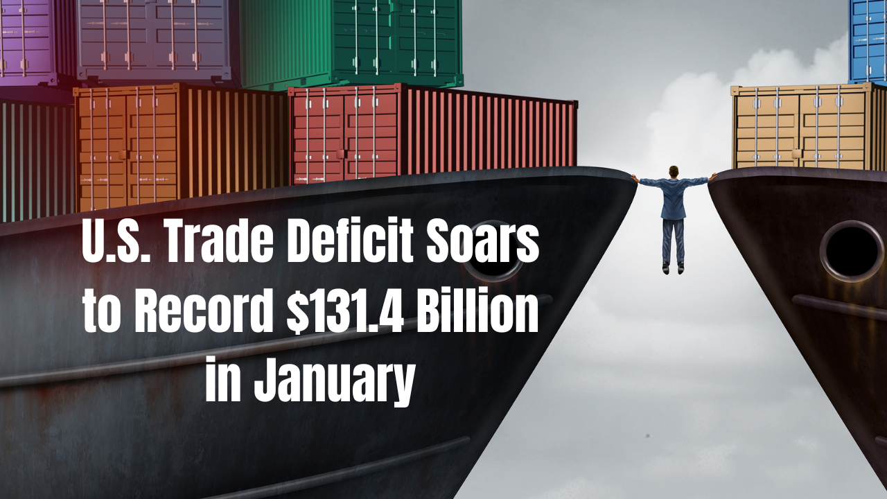 In January 2025, the United States’ international trade deficit surged to a record $131.4 billion, marking a 34% increase from December’s revised deficit of $98.1 billion, according to the U.S. Census Bureau and U.S. Bureau of Economic Analysis.