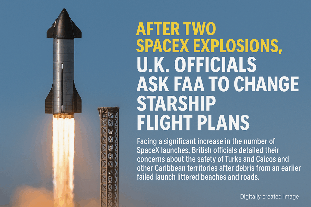 The British letter to a U.S. State Department official, Ambassador Lisa Kenna, asks the U.S. to consider changing the launch site or trajectory of Starship 9. If that isn’t possible, the request — from Stephen Doughty, the United Kingdom’s minister of state for Europe, North America and U.K. Overseas Territories — asks that agencies like the FAA consider altering the launch’s timing to minimize safety risks and the economic impact for the British territories.