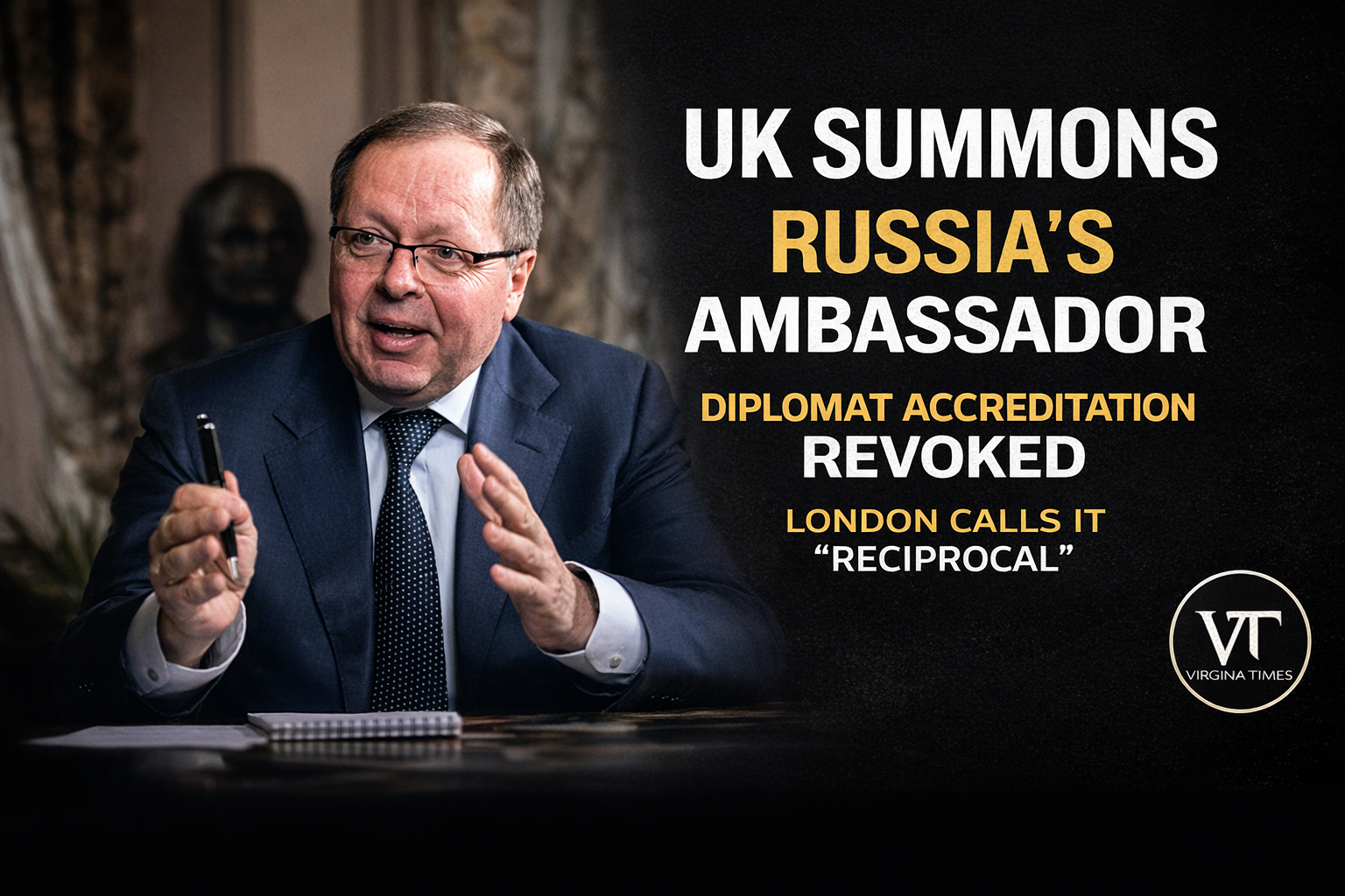 The UK said the Russian ambassador was summoned for the meeting as London moved to revoke a Russian diplomat’s accreditation in response to Moscow’s earlier decision.