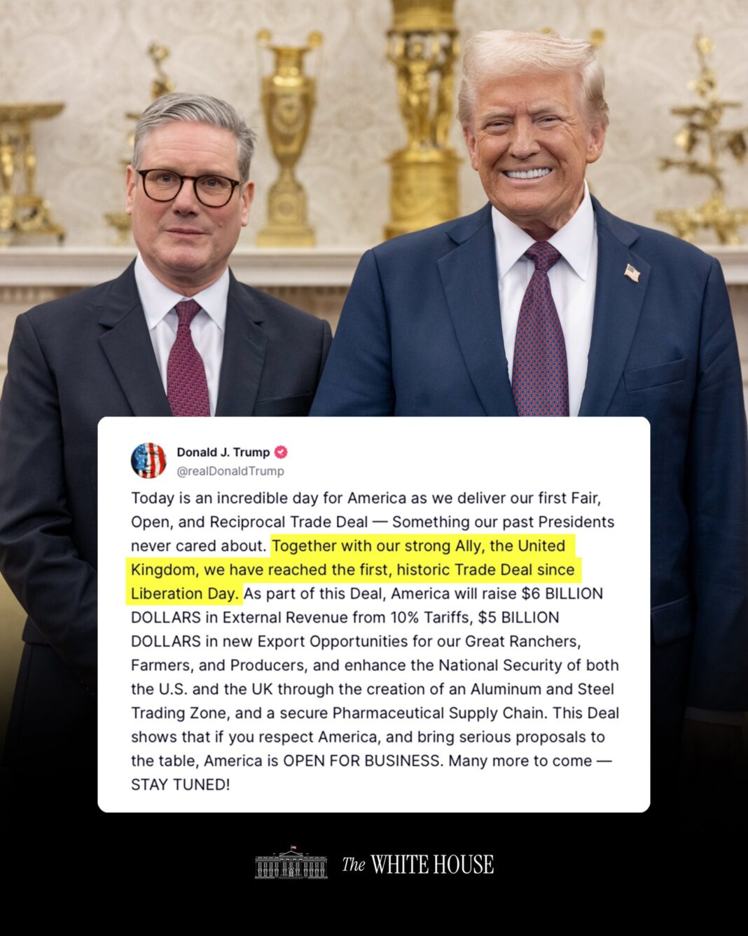 “Today is an incredible day for America… We will raise $6 BILLION in external revenue from 10% tariffs, $5 BILLION in new export opportunities, and enhance the national security of both the U.S. and the UK. This deal shows that if you respect America… America is OPEN FOR BUSINESS. Many more to come—STAY TUNED!”