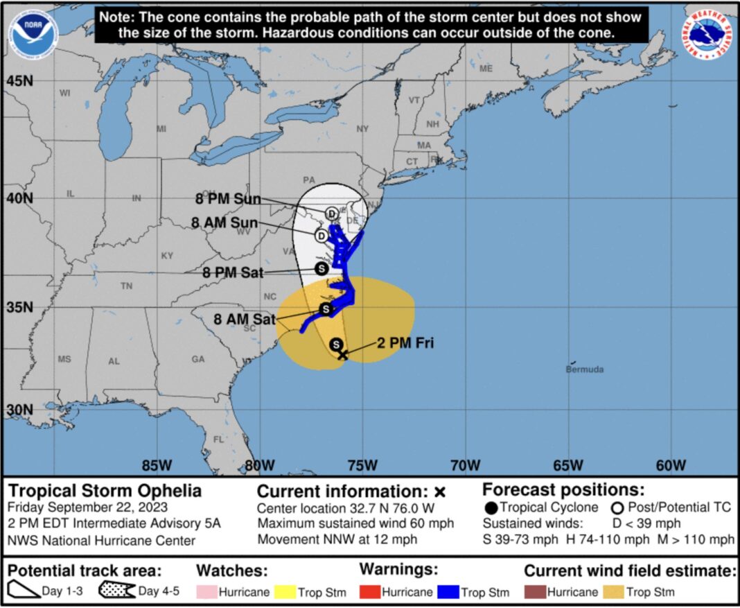The NHC issued a tropical storm warning for parts of the North Carolina coast, from Cape Lookout to Duck, including Pamlico and Albemarle Sounds. A tropical storm watch is in effect for parts of the Virginia coast, from Duck to Chincoteague, including Chesapeake Bay south of New Point Comfort.