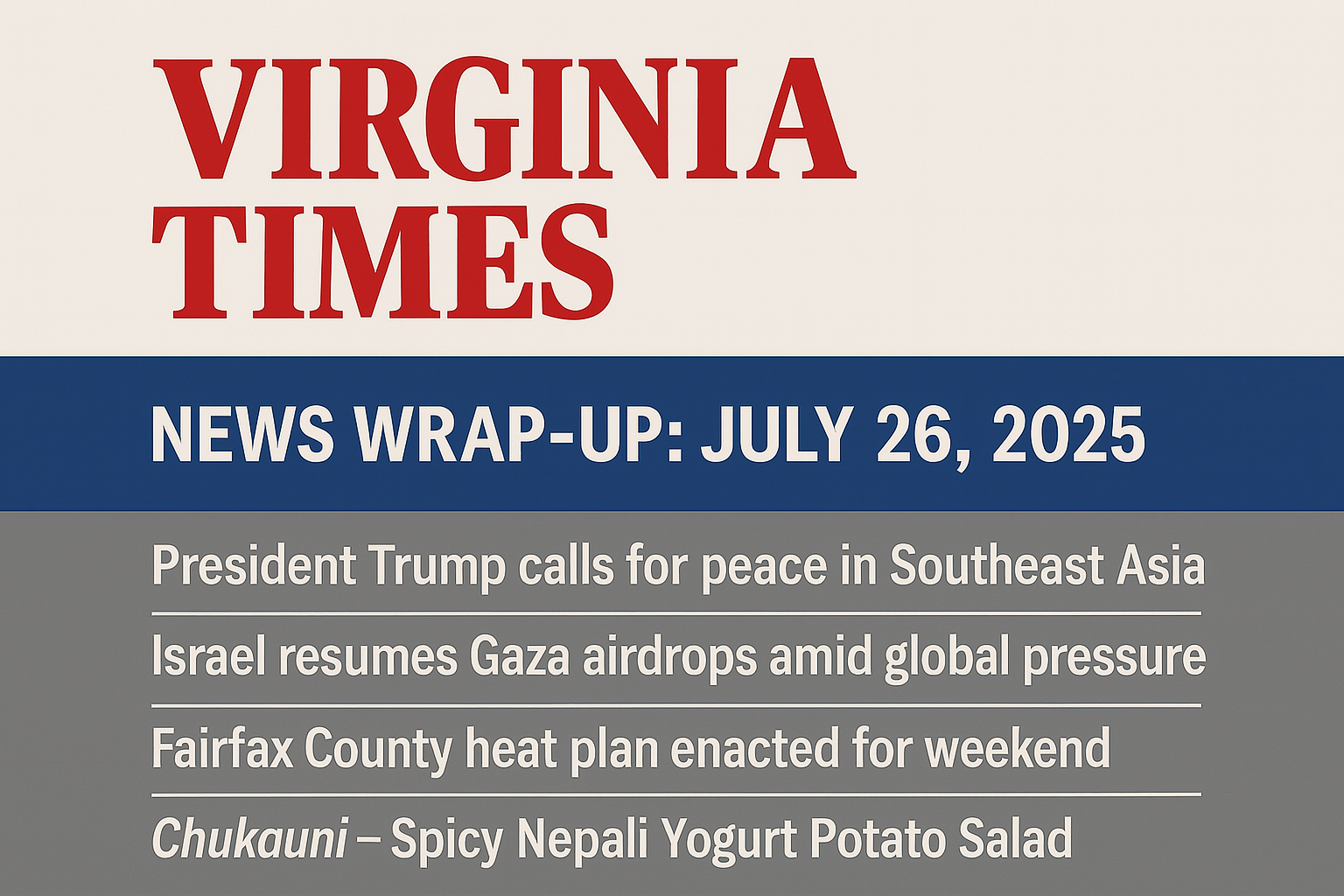 Top developments include President Trump’s call for peace in Southeast Asia, the resumption of Israeli humanitarian airdrops over Gaza, Fairfax County’s emergency heat plan for the weekend, and the U.S. Postal Service’s 250th anniversary celebrations. Plus, we dive into trending political sentiment, food security awareness at the U.S. border, and culinary heritage from Nepal.
