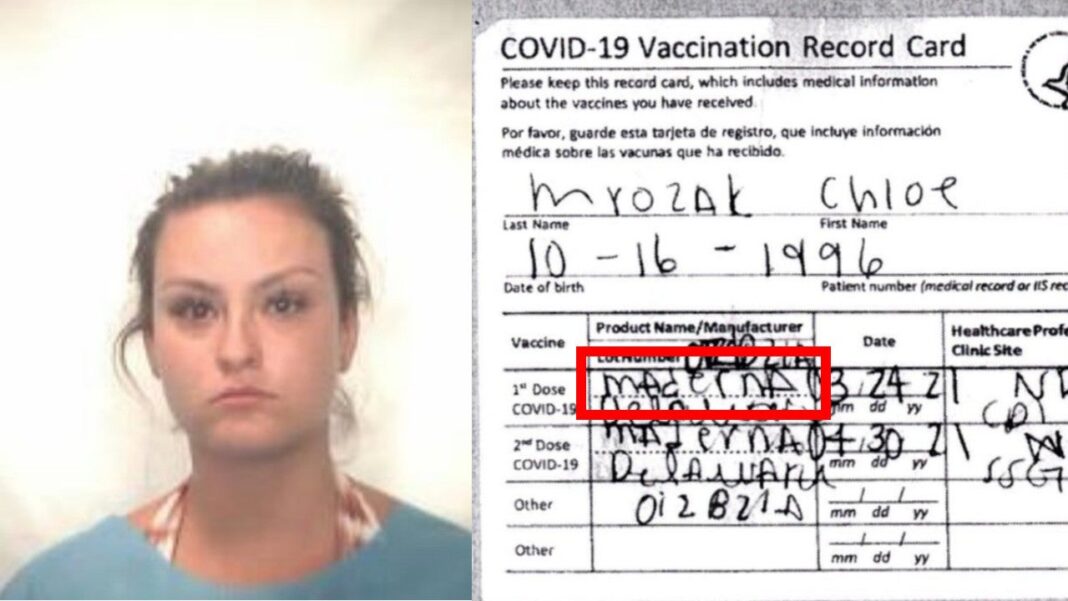 Mrozak, who was arrested in Hawaii for falsifying her vaccination card in order to comply with state travel regulations appears to have written “Maderna” instead of “Moderna” on it.